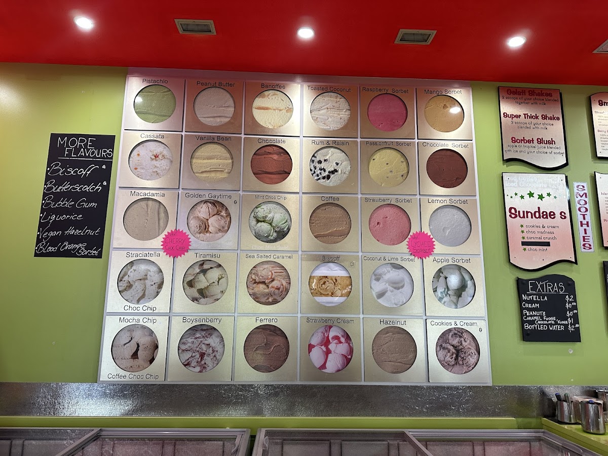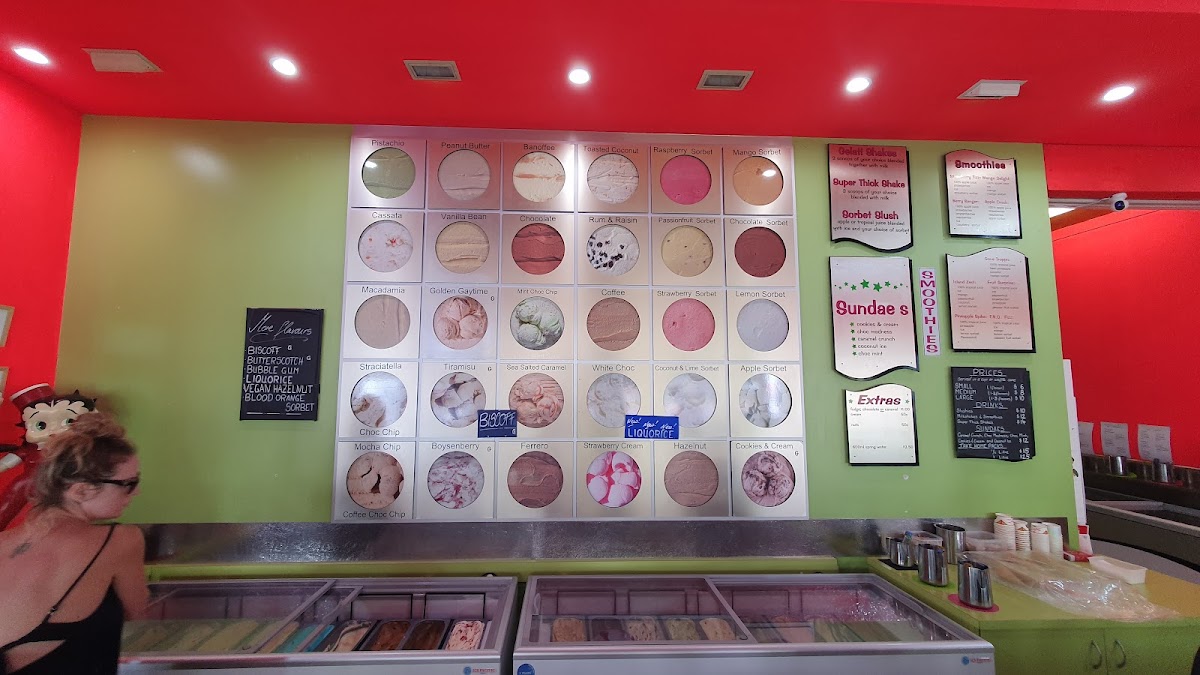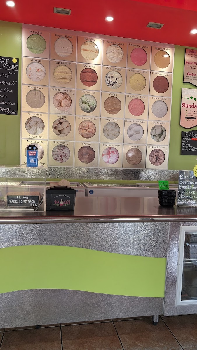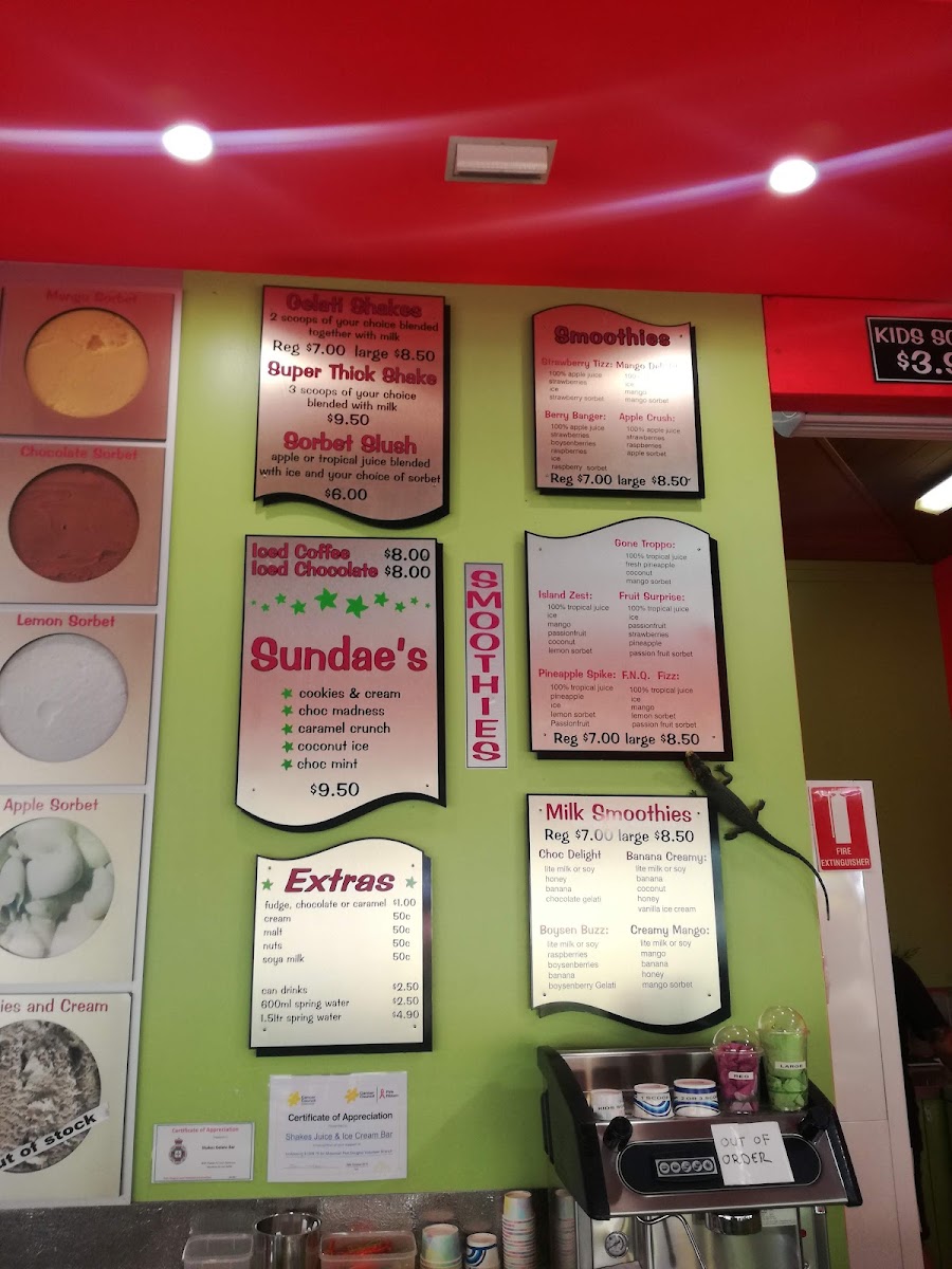 Shakes Ice Cream Bar in Port Douglas offers a delightful selection of treats to satisfy any sweet tooth. Their sundae menu features classic favorites such as Cookies & Cream, Choc Madness, and Caramel Crunch, with options like Coconut Ice and Choc Mint adding a fun twist. Prices are not specified, but the variety promises a unique indulgence for every palate. For those looking to customize, a range of Extras is available, including Fudge, Cream, Malt Nuts, and Soya Milk. The milk smoothies are equally tempting, with flavors like Boysen Buzz, Choc Delight, Banana Creamy, and Creamy Mango. To top it off, the menu also offers signature drinks like Pistachio, Super Thick Shake, Iced Chocolate, and the refreshing Island Zest, along with Leed Coffee for a more robust pick-me-up. Whether you're craving a decadent sundae or a refreshing smoothie, Shakes Ice Cream Bar has a satisfying option for every taste.